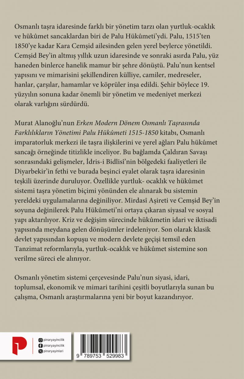 Murat Alanoglu’nun Erken Modern Dönem Osmanlı Taşrasında Farklılıkların Yönetimi: Palu Hükümeti 1515–1850 kitabı, Osmanlı imparatorluk merkezi ile taşra ilişkilerini ve yerel ağları Palu hükümet sancağı örneğinde titizlikle inceliyor. Bu bağlamda Çaldıran Savaşı sonrasındaki gelişmeler, İdris-i Bitlisi’nin bölgedeki faaliyetleri ile Diyarbakır’ın fethi ve burada beşinci eyalet olarak taşra idaresinin teşkili üzerinde duruluyor. Özellikle yurtluk-ocaklık ve hükümet sistemi taşra yönetim biçimi yönünden ele alınarak bu sistemin yereldeki uygulamalarına değiniliyor. Mirdasî Aşireti ve Cemsid Bey’in soyuna değinilerek Palu Hükümeti’ni ortaya çıkaran siyasal ve sosyal yapı aktarılıyor. Kriz ve değişim sürecinde hükümetin idari ve iktisadi yapısında meydana gelen dönüşüm irdeleniyor. Son olarak klasik devlet yapısından kopuşu ve modern devlete geçişi temsil eden Tanzimat reformlarıyla, yurtluk-ocaklık ve hükümet sistemine son verilme süreci ele alınıyor.