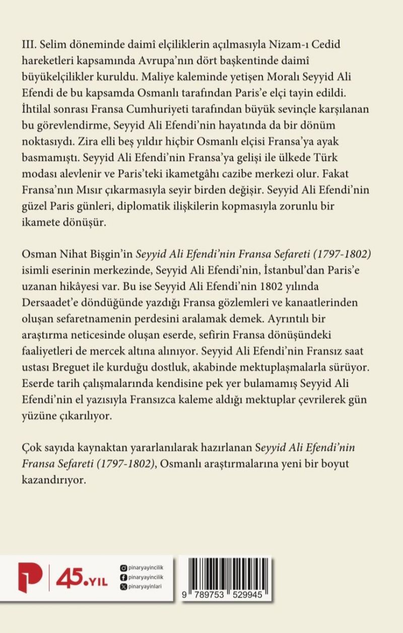 Osman Nihat Bişgin’in Seyyid Ali Efendi’nin Fransa Sefareti (1797-1802) isimli eserinin merkezinde, Seyyid Ali Efendi’nin, İstanbul’dan Paris’e uzanan hikâyesi var. Bu ise Seyyid Ali Efendi’nin 1802 yılında Dersaadet’e döndüğünde yazdığı Fransa gözlemleri ve kanaatlerinden oluşan sefaretnamenin perdesini aralamak demek. Ayrıntılı bir araştırma neticesinde oluşan eserde, sefirin Fransa dönüşündeki faaliyetleri de mercek altına alınıyor. Seyyid Ali Efendi’nin Fransız saat ustası Breguet ile kurduğu dostluk, akabinde mektuplaşmalarla sürüyor. Eserde tarih çalışmalarında kendisine pek yer bulamamış Seyyid Ali Efendi’nin el yazısıyla Fransızca kaleme aldığı mektuplar çevrilerek gün yüzüne çıkarılıyor.