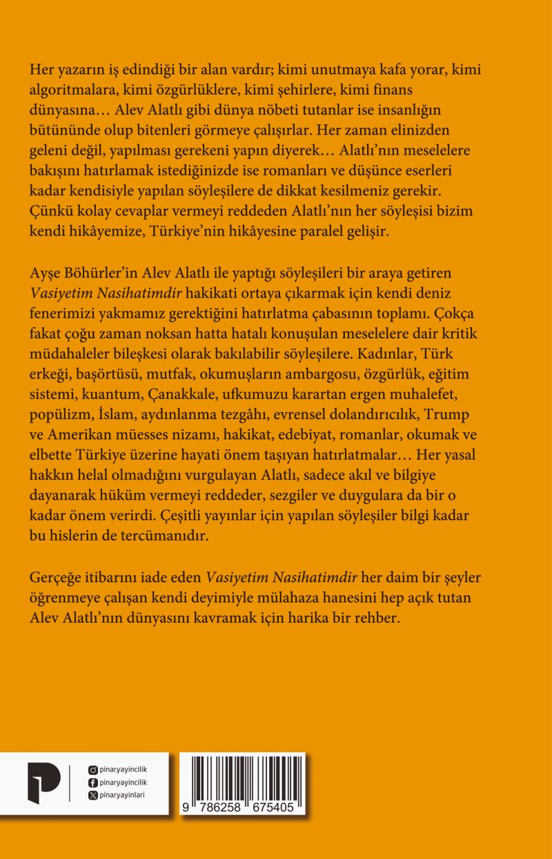 Ayşe Böhürler’in Alev Alatlı ile yaptığı söyleşileri bir araya getiren Vasiyetim Nasihatimdir hakikati ortaya çıkarmak için kendi deniz fenerimizi yakmamız gerektiğini hatırlatma çabasının toplamı. Çokça fakat çoğu zaman noksan hatta hatalı konuşulan meselelere dair kritik müdahaleler bileşkesi olarak bakılabilir söyleşilere. Kadınlar, Türk erkeği, başörtüsü, mutfak, okumuşların ambargosu, özgürlük, eğitim sistemi, kuantum, Çanakkale, ufkumuzu karartan ergen muhalefet, popülizm, İslam, aydınlanma tezgâhı, evrensel dolandırıcılık, Trump ve Amerikan müesses nizamı, hakikat, edebiyat, romanlar, okumak ve elbette Türkiye üzerine hayati önem taşıyan hatırlatmalar… Her yasal hakkın helal olmadığını vurgulayan Alatlı, sadece akıl ve bilgiye dayanarak hüküm vermeyi reddeder, sezgiler ve duygulara da bir o kadar önem verir. Çeşitli yayınlar için yapılan söyleşiler bilgi kadar bu hislerin de tercümanıdır.