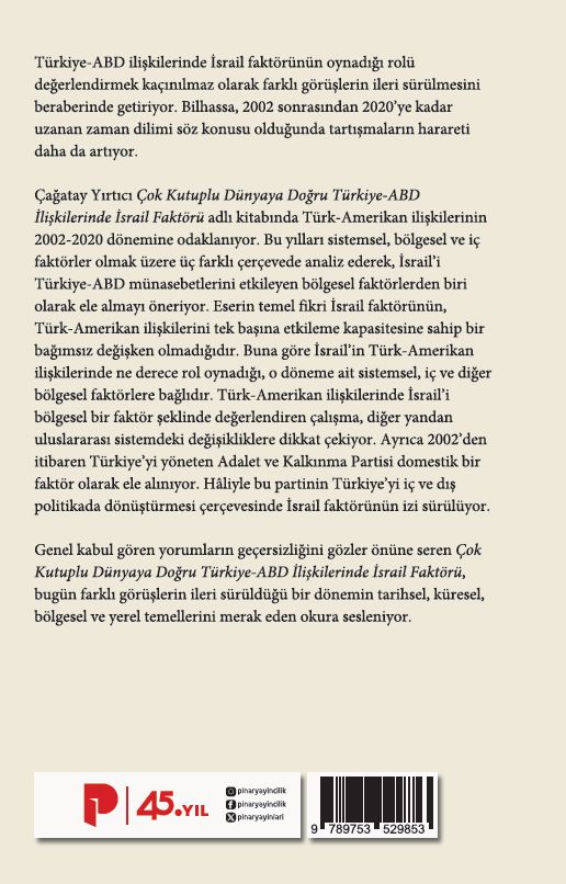 Çağatay Yurtçu, “Çok Kutuplu Dünyaya Doğru Türkiye-ABD İlişkilerinde İsrail Faktörü” adlı kitabında Türk-Amerikan ilişkilerinin 2002-2020 dönemine odaklanıyor. Bu yılları sistemsel, bölgesel ve iç faktörler olmak üzere üç farklı çerçevede analiz ederek, İsrail’i Türkiye-ABD münasebetlerini etkileyen bölgesel faktörlerden biri olarak ele almayı öneriyor. Eserin temel fikri İsrail faktörünün, Türk-Amerikan ilişkilerini tek başına etkileme kapasitesine sahip bir bağımsız değişken olmadığıdır. Buna göre İsrail’in Türk-Amerikan ilişkilerinde ne derece rol oynadığı, o döneme ait sistemsel, iç ve diğer bölgesel faktörlere bağlıdır. Türk-Amerikan ilişkilerinde İsrail bölgesel bir faktör şeklinde değerlendirilen çalışmada, diğer analiz düzeylerinin sistemsel değişikliklere dikkat çekiyor. Ayrıca 2002’den itibaren Türkiye’yi yöneten Adalet ve Kalkınma Partisi, domestik bir faktör olarak ele alınıyor. Haliyle bu partinin Türkiye içi ve dış politikada dönüştürücü sermayesinin İsrail faktörünün izini sürdürdüğü görülüyor.