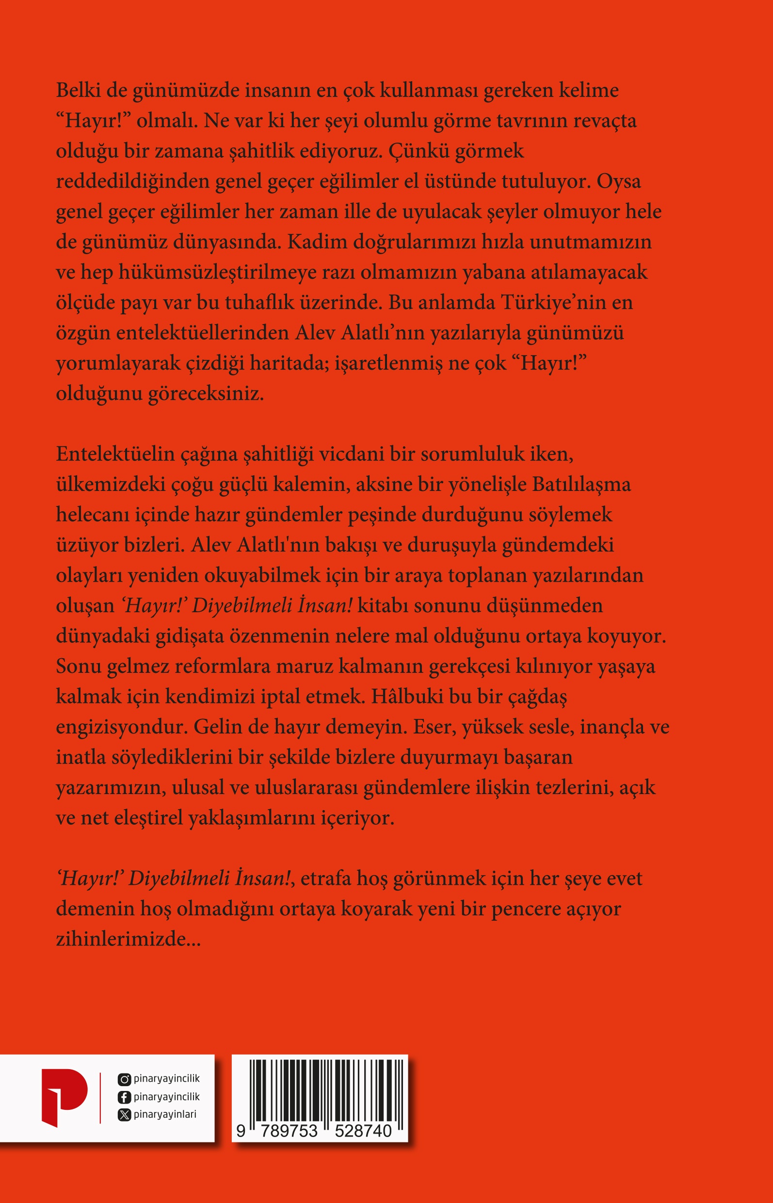 Bu anlamda Türkiye’nin en özgün entelektüellerinden Alev Alatlı’nın yazılarıyla günümüzü yorumlayarak çizdiği haritada; işaretlenmiş ne çok “Hayır!” olduğunu göreceksiniz. Entelektüelin çağına şahitliği vicdani bir sorumluluk iken, ülkemizdeki çoğu güçlü kalemin, aksine bir yönelişle Batılılaşma helecanı içinde hazır gündemler peşinde durduğunu söylemek üzüyor bizleri. Alev Alatlının bakışı ve duruşuyla gündemdeki olayları yeniden okuyabilmek için bir araya toplanan yazılarından oluşan ‘Hayır!’ Diyebilmeli İnsan kitabı sonunu düşünmeden dünyadaki gidişata özenmenin nelere mal olduğunu ortaya koyuyor. Sonu gelmez reformlara maruz kalmanın gerekçesi kılınıyor yaşayakalmak için kendimizi iptal etmek. Hâlbuki bu bir çağdaş engizisyondur. Gelin de hayır demeyin. Eser, yüksek sesle, inançla ve inatla söylediklerini bir şekilde bizlere duyurmayı başaran yazarımızın, ulusal ve uluslararası gündemlere ilişkin tezlerini, açık ve net eleştirel yaklaşımlarını içeriyor.
