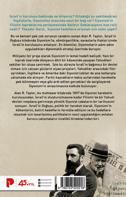 Bu ve benzeri pek çok sorunun cevabını sunan Alan R. Taylor, İsrailin Doğuşu kitabında Siyonizmle, sömürgecilikle, savaşlarla ilişkisi içinde İsrailin kuruluşunu anlatıyor. En önemlisi, Siyonistlerin adım adım uyguladıkları diplomatik strateji üzerinde duruyor.