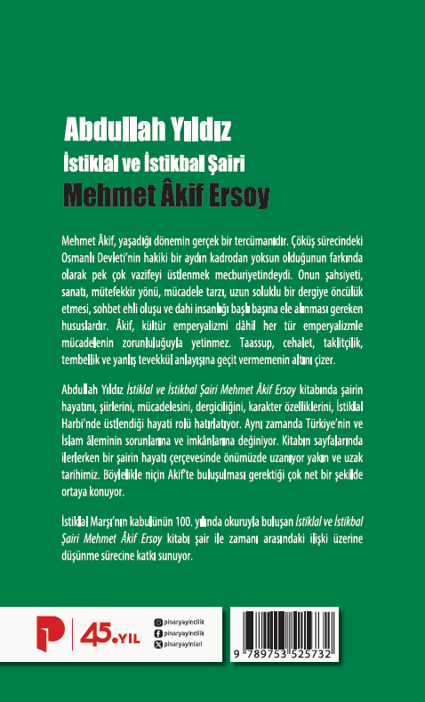Abdullah Yıldız İstiklal ve İstikbal Şairi Mehmet Âkif Ersoy kitabında şairin hayatını, şiirlerini, mücadelesini, dergiciliğini, karakter özelliklerini, İstiklal Harbinde üstlendiği hayati rolü hatırlatıyor. Aynı zamanda Türkiyenin ve İslam âleminin sorunlarına ve imkânlarına değiniyor. Kitabın sayfalarında ilerlerken bir şairin hayatı çerçevesinde önümüzde uzanıyor yakın ve uzak tarihimiz. Böylelikle niçin Akifte buluşulması gerektiği çok net bir şekilde ortaya konuyor.