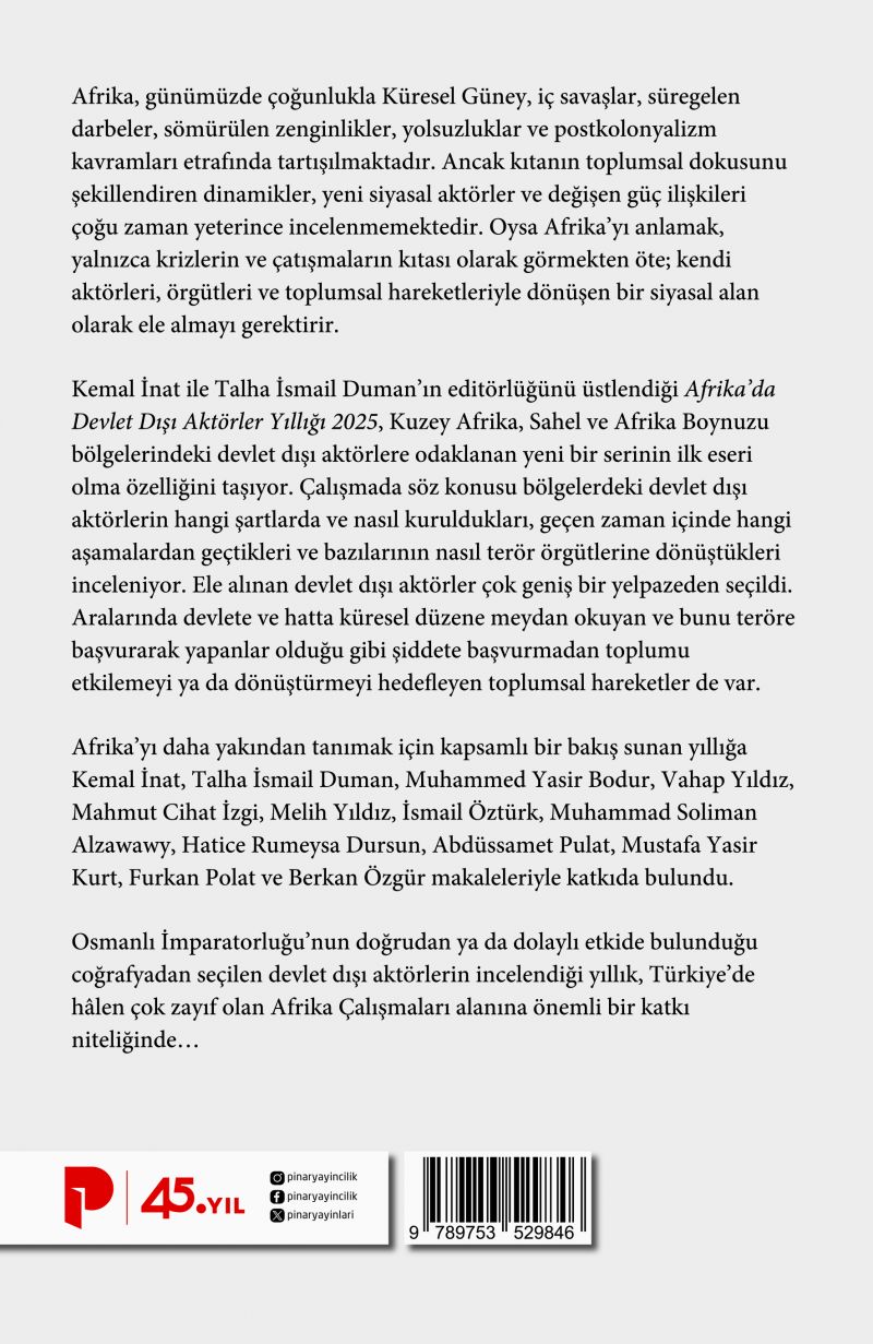 Kemal İnat ile Talha İsmail Duman’ın editörlüğünü üstlendiği Afrika’da Devlet Dışı Aktörler Yıllığı 2025, Kuzey Afrika, Sahel ve Afrika Boynuzu bölgelerindeki devlet dışı aktörlere odaklanan yeni bir serinin ilk eseri olma özelliğini taşıyor. Çalışmada söz konusu bölgelerdeki devlet dışı aktörlerin hangi şartlarda ve nasıl kurulduukları, geçen zaman içinde hangi aşamalardan geçtikleri ve bazılarının nasıl terör örgütlerine dönüştükleri inceleniyor. Ele alınan devlet dışı aktörler çok geniş bir yelpazeden seçildi. Aralarında devlete ve hatta küresel düzene meydan okuyan ve bunu teröre başvurarak yapanlar olduğu gibi şiddete başvurmadan toplumu etkilemeye ya da dönüştürmeyi hedefleyen toplumsal hareketler de var.