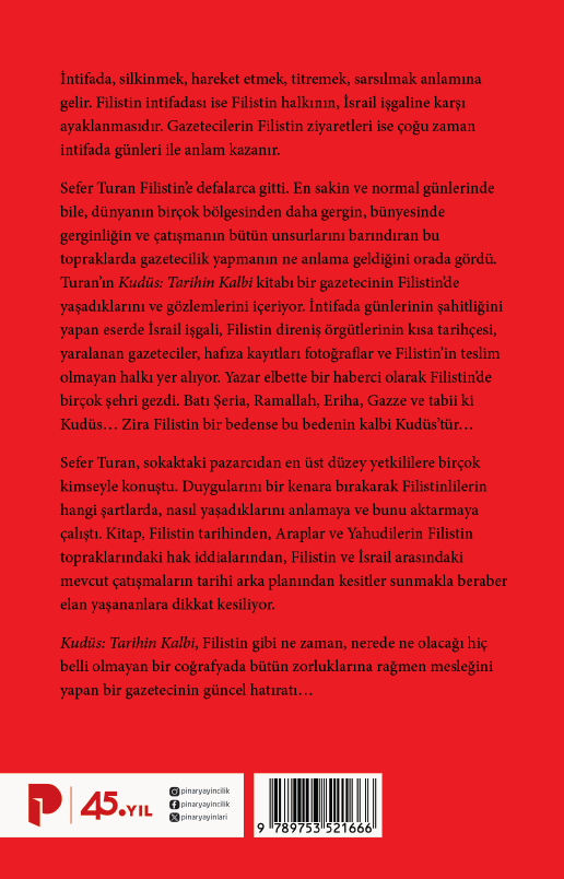Sefer Turan Filistine defalarca gitti. En sakin ve normal günlerinde bile, dünyanın birçok bölgesinden daha gergin, bünyesinde gerginliğin ve çatışmanın bütün unsurlarını barındıran bu topraklarda gazetecilik yapmanın ne anlama geldiğini orada gördü. Turanın Kudüs: Tarihin Kalbi kitabı bir gazetecinin Filistinde yaşadıklarını ve gözlemlerini içeriyor.