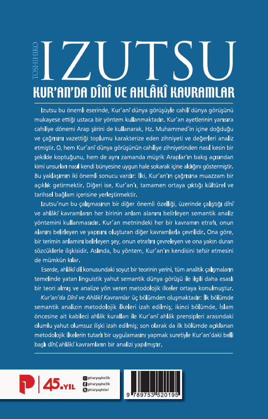 Kuranda Dini ve Ahlaki Kavramlar üç bölümden oluşmak-tadır: ilk bölümde semantik analizin metodolojik ilkeleri izah edilmiş; ikinci bölümde, İslam öncesine ait kabileci ahlâk kuralları ile Kuranî ahlâk prensipleri arasındaki olumlu yahut olumsuz ilişki izah edilmiş; son olarak da ilk bölümde açıklanan metodolojik ilkelerin tutarlı bir uygulamasını yapmak suretiyle Kurandaki belli başlı dinî-ahlâkî kavramların bir analizi yapılmıştır.