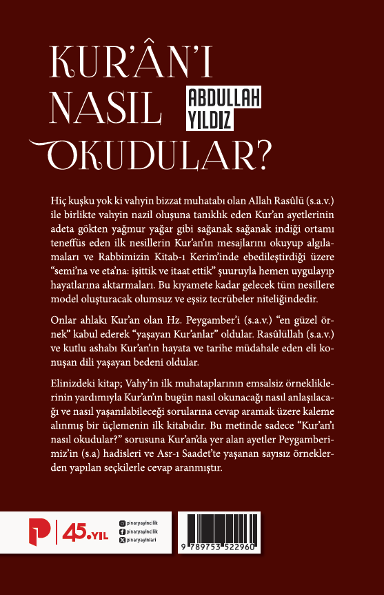 Bu metinde sadece "Kuranı nasıl okudular?" sorusuna, Kuranda yer alan ayetler, Peygamberimizin (s.a) hadisleri ve Asr-ı Saadette yaşanan sayısız örneklerden yapılan seçkilerle cevap aranmıştır.